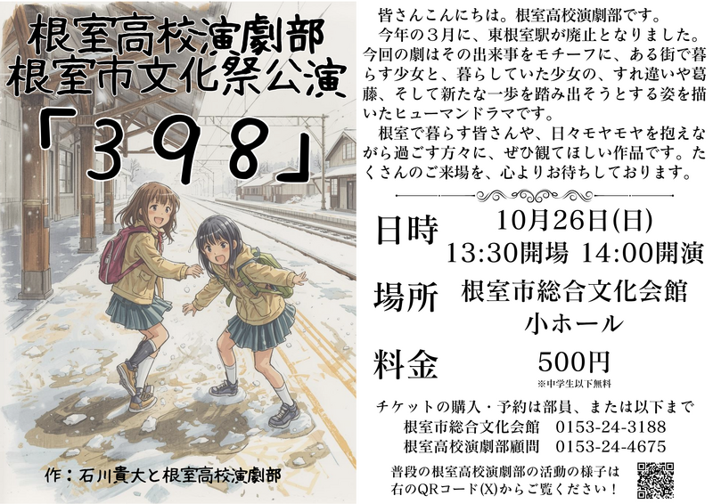 その優秀賞を獲った作品『398』を今月26日(日)に根室市文化祭で上演します。