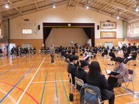 緊急地震速報のアナウンスが流れると、生徒たちは直ちに机の下に身を隠すなどの初期行動(シェイクアウト)を行いました。その後、教員の指示に従い避難場所である体育館へ避難しました。